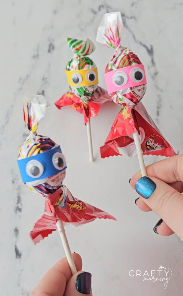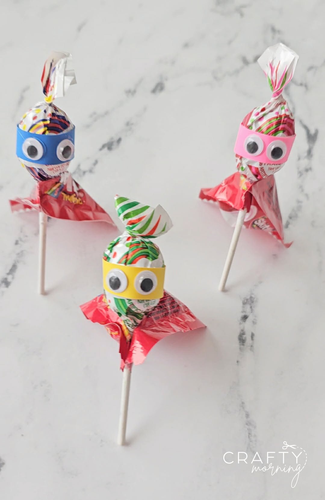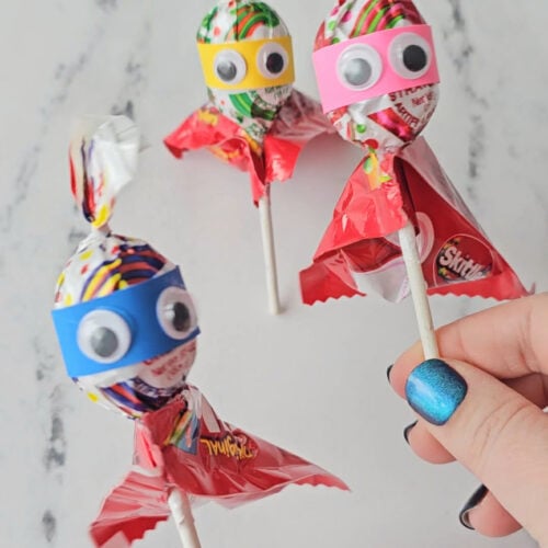 Make cute little superhero treats for Valentine’s Day! This is pretty simple and would be great to hand out in the classroom.