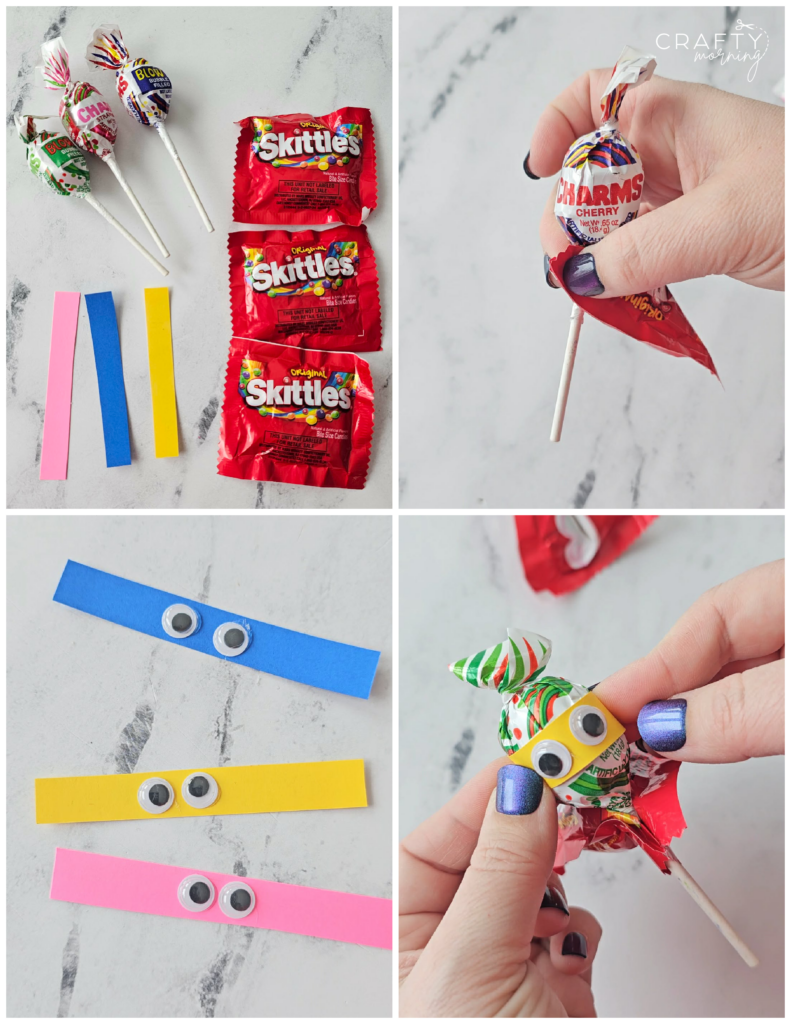 - Put a strip of hot glue on the paper and wrap around the sucker.