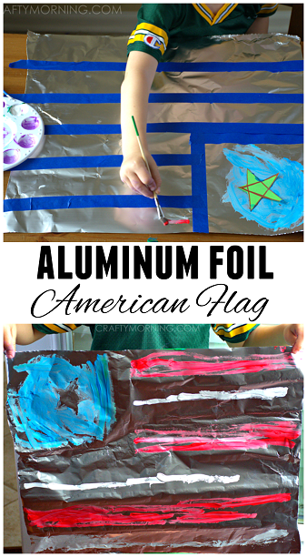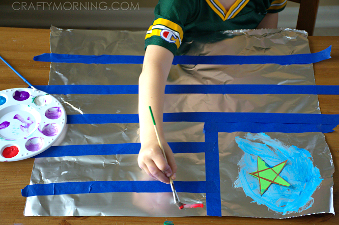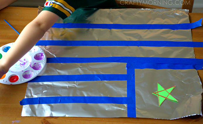 Start by ripping a rectangle piece from the tin foil. Grab some blue painters tape and make the stripes. Cut out a star from card stock paper and tape it to the flag. Have the kids paint over it with blue.