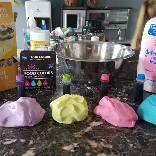 You will need cornstarch, baby lotion, and food coloring if you want to make different colors! The recipe below makes 4 small balls or 1 giant one. My son loved to mix the colors together, he said the pink and blue one looked like cotton candy! He also kept telling me to “pet” the dough to see how soft it was lol!