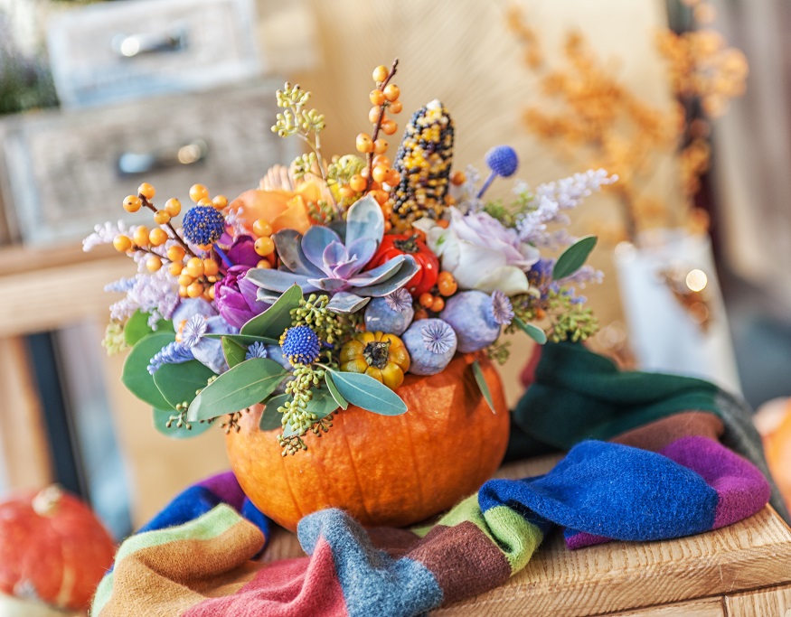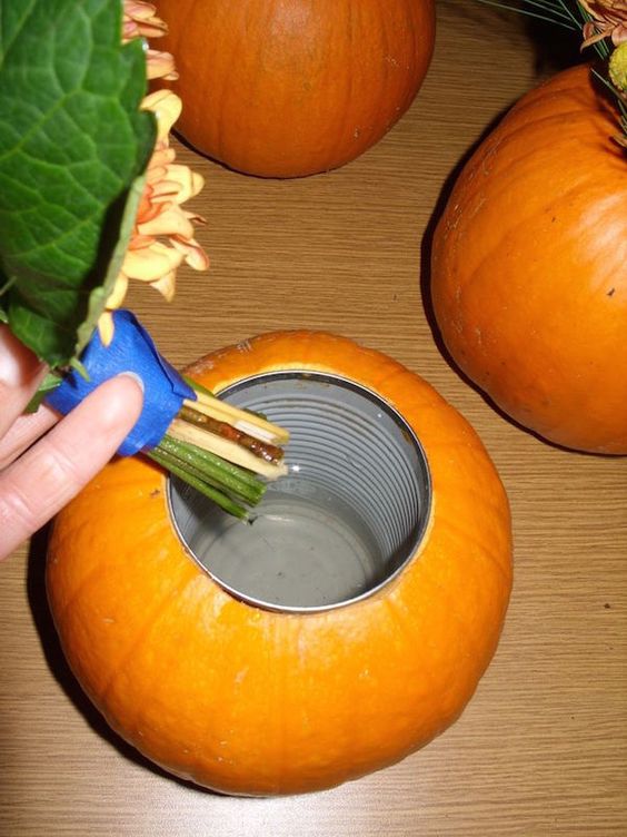 This genius idea is from Meenie Greenie (no longer available) but they measured a coffee tin, drew with a sharpie and cut the hole. Then they scooped it out and stuck it in. Fill with water and some fall flowers! Love! If you have smaller pumpkins, use an empty soup can.