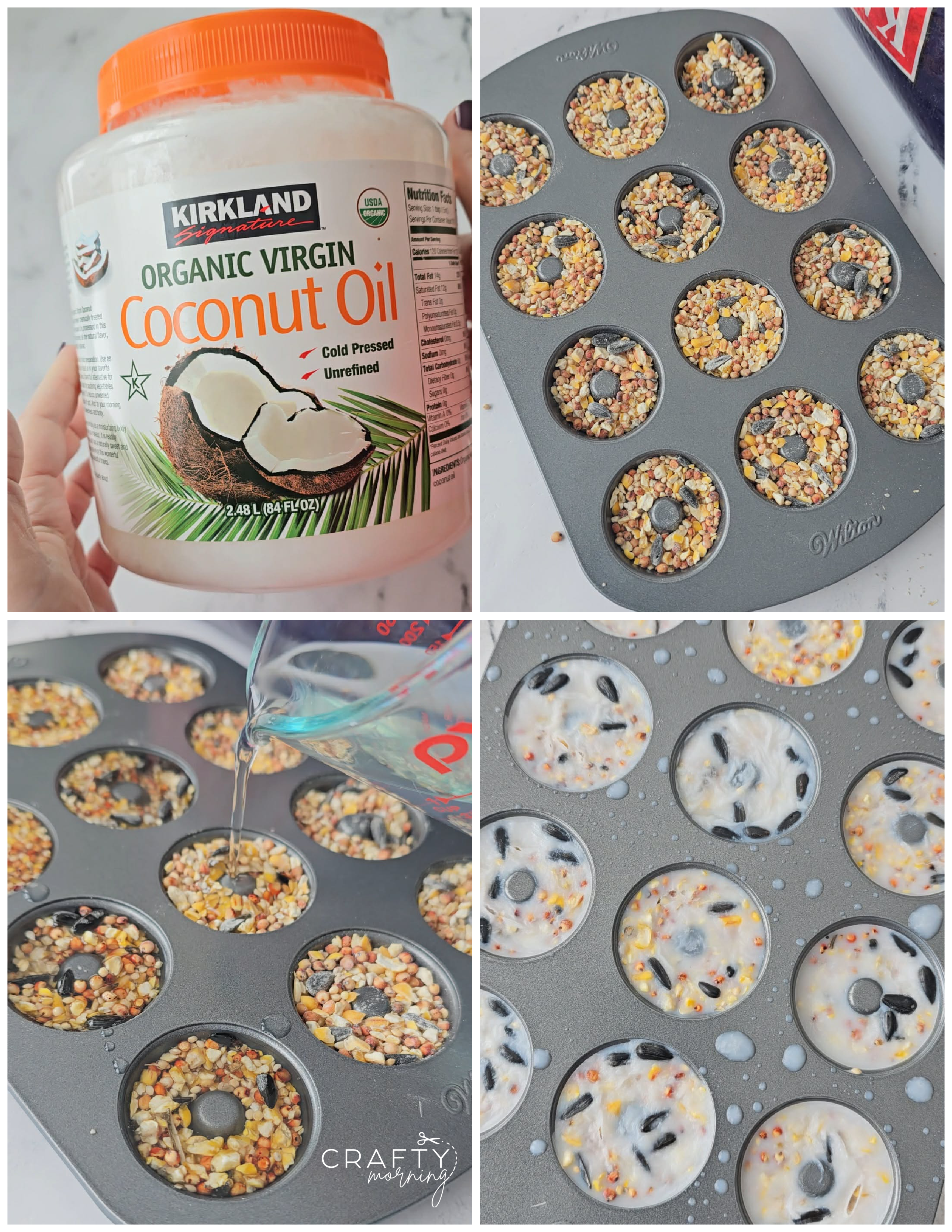 - Fill each donut in the pan with bird seed.