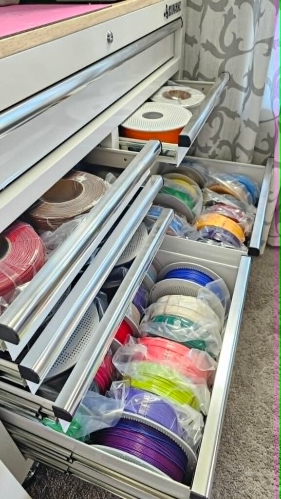 I bought a Husky rolling toolbox that sits on my carpet. Every drawer is full of filament rolls, they fit perfectly! It comes with black foam for each drawer so nothing will move around either. If you have a wood floor I am not sure how it would be though. It does shake a bit but not bad. I also bought this pink mat which also flips over to purple color that I LOVE!