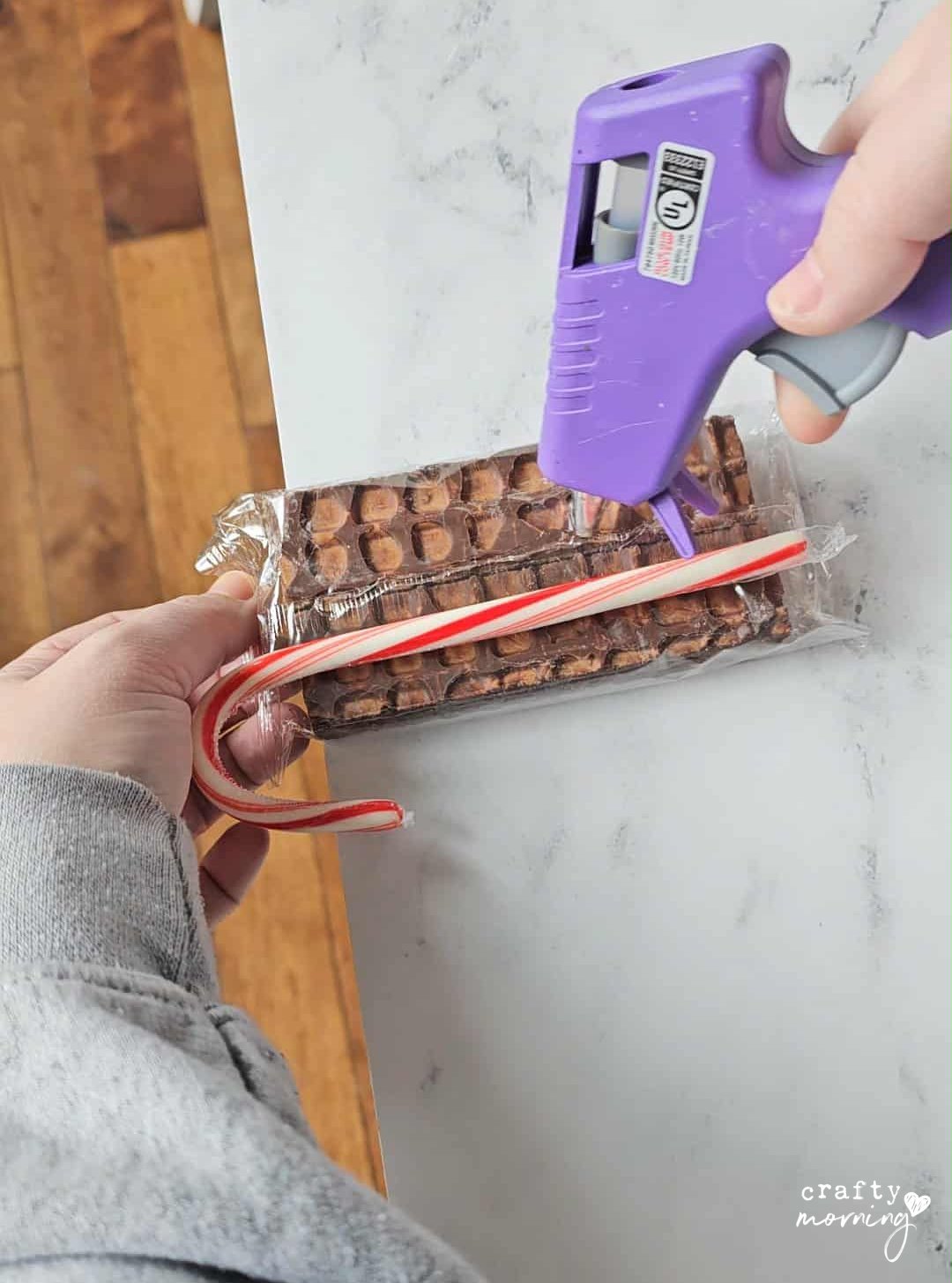 - Start by flipping over the nutty butty bar package and putting a strip of hot glue. Press a candy cane sideways on it for 30 seconds.