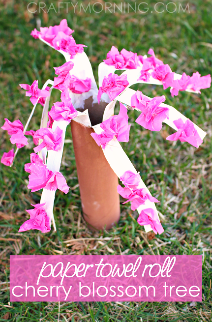 Start by cutting slits in the top of a paper towel roll then paint the “branches” white. Scrunch up little pieces of pink tissue paper and stick them all over the tree. You can do this while the white paint is wet or wait and use elmer’s glue.