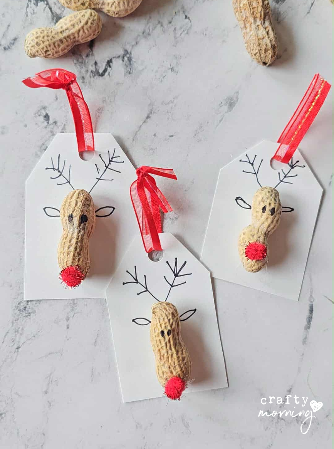 Use your hole puncher to make a little hole at the top for the ribbon later. - Add your peanut reindeer: