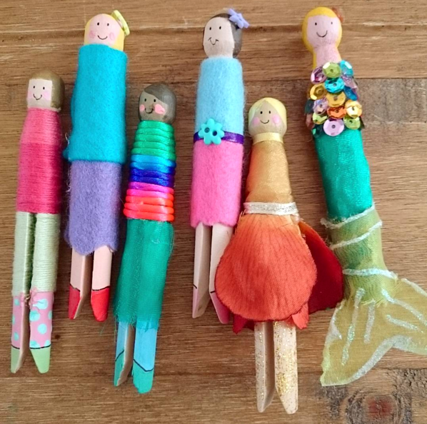 I came across these darling peg doll crafts on Instagram from PeaGreenandBlue‘s account! She used yarn, fake flower petals, sequins, and other fabrics to make their clothes! My favorite is the mermaid with the tail :-) If you don’t want to wait for elmer’s glue to dry, try a hot glue gun or super glue.