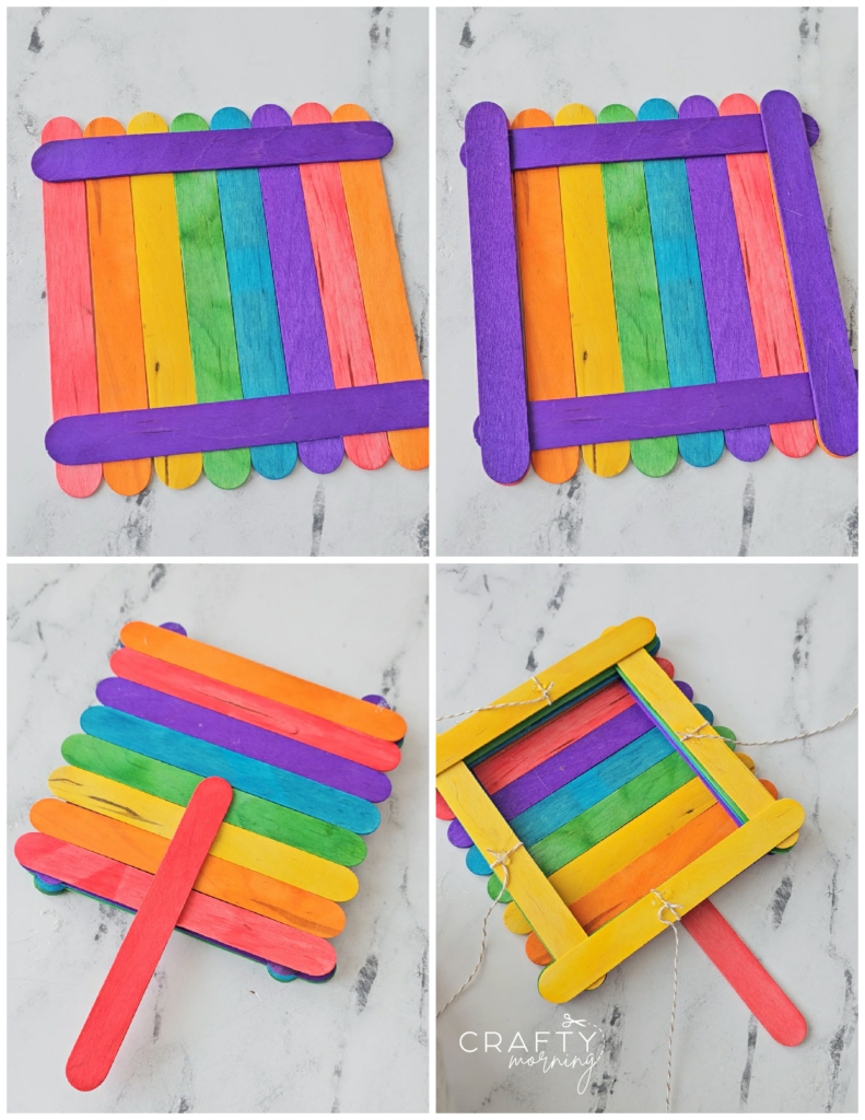 - Continue hot gluing different color squares about 3 layers. Cut 4 strings the same length. Then tie a string in the middle of 4 popsicle sticks. Hot glue them down.