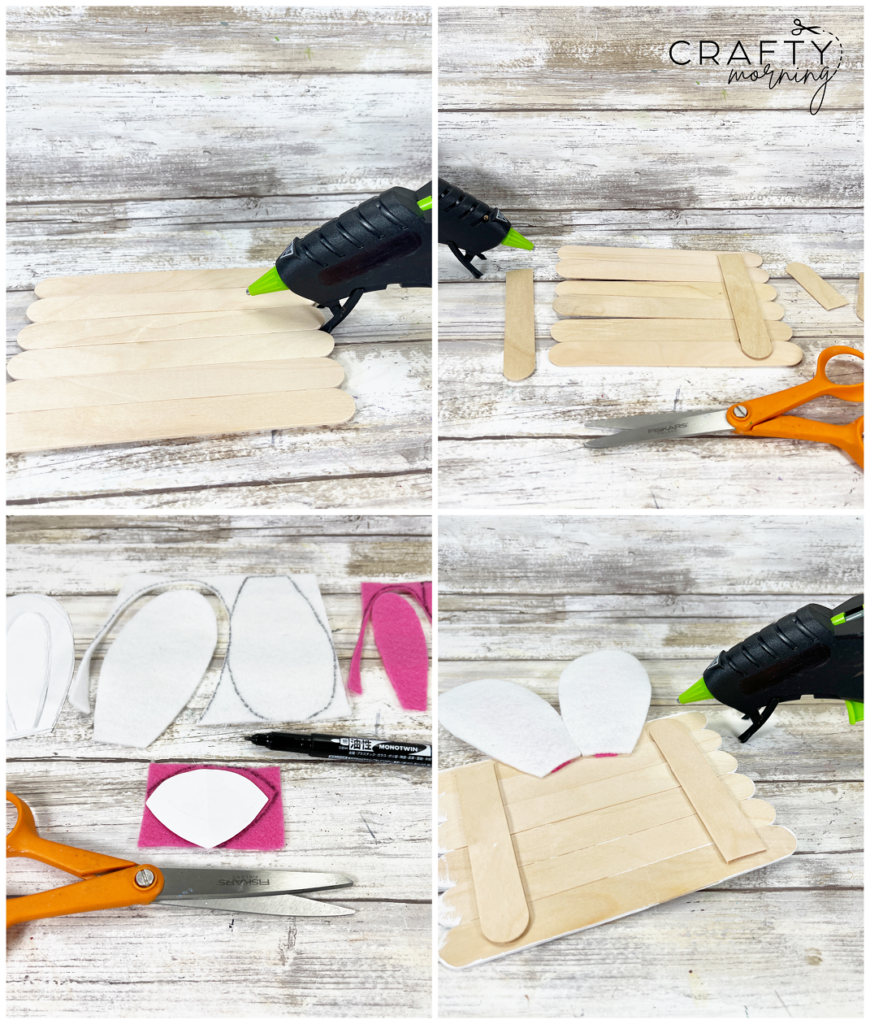 - Gather all supplies. To create the Bunny, line up six jumbo craft sticks on your work surface. Using scissors, trim additional jumbo craft sticks to the width of the Bunny and attach with a glue gun and glue sticks. TIP: You can use liquid craft glue for this project, but you will have to wait for it to dry.
