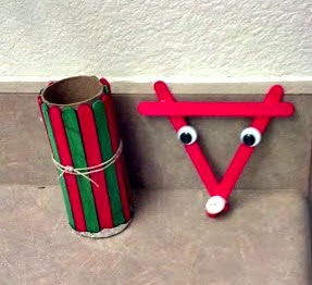 They also made a cute reindeer and my favorite…a Christmas vase made out of a recycled toilet paper rolls! Just glue red and green popsicle sticks around the tube and tie a string. LOVE it!