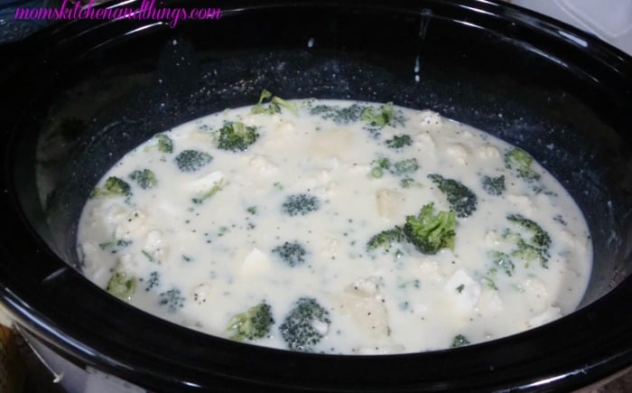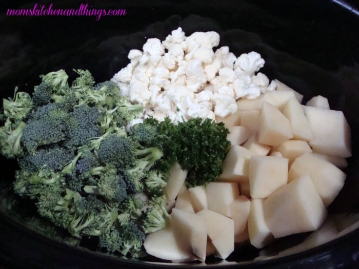 - Place the potatoes, broccoli, cauliflower, and parsley in crock pot.