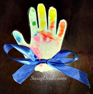 Here is a simple craft for kids in Preschool or Kindergarten. I know parents always love having a memory of how small their child’s handprint is so it’s a great keepsake gift! To make this present last longer consider using a laminator and a glue gun.