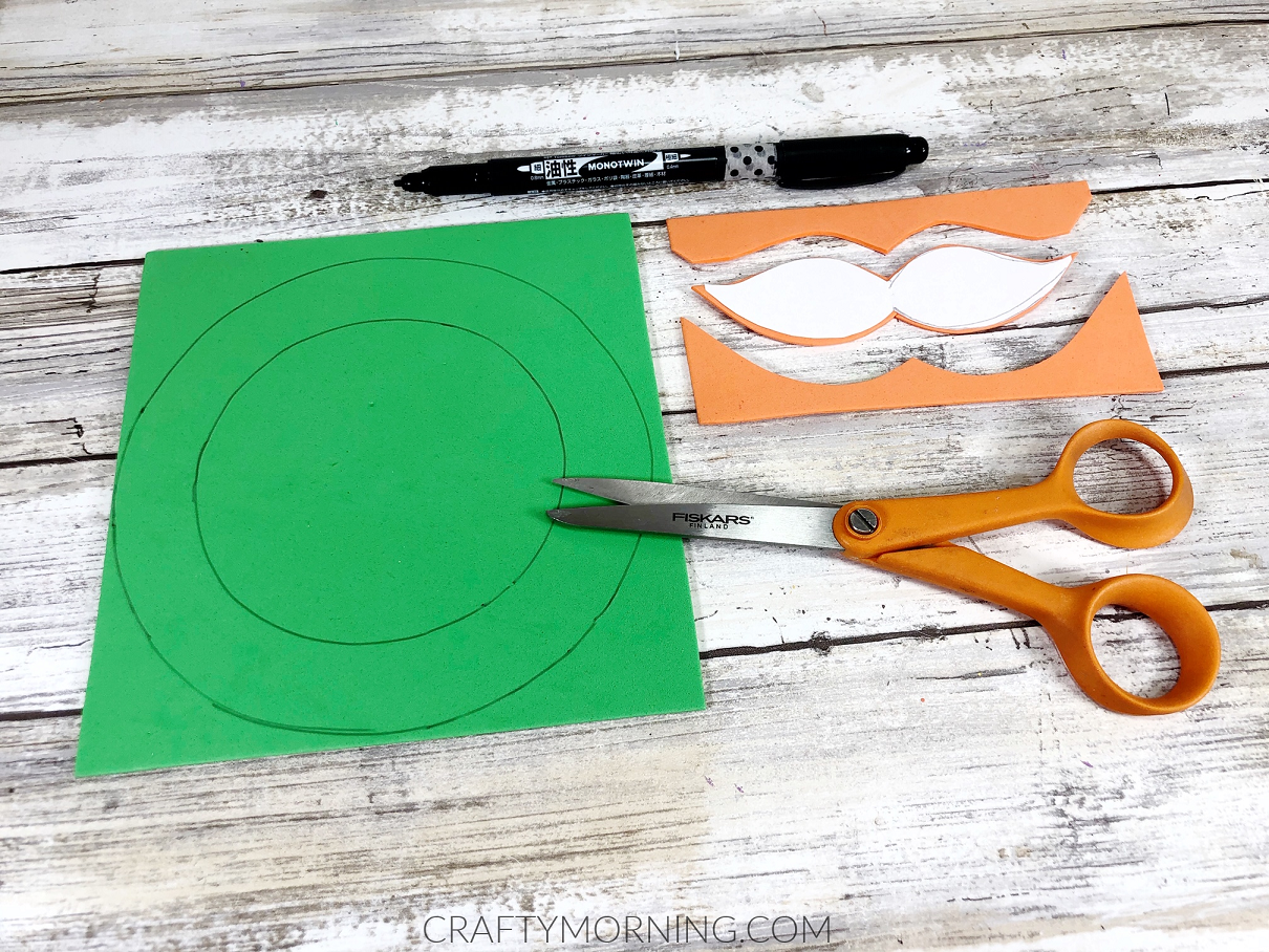 - Trace hat brim pattern onto green craft foam with a with a pencil or marker. Trace mustache pattern onto orange craft foam with a pencil or marker. Cut out patterns with scissors.