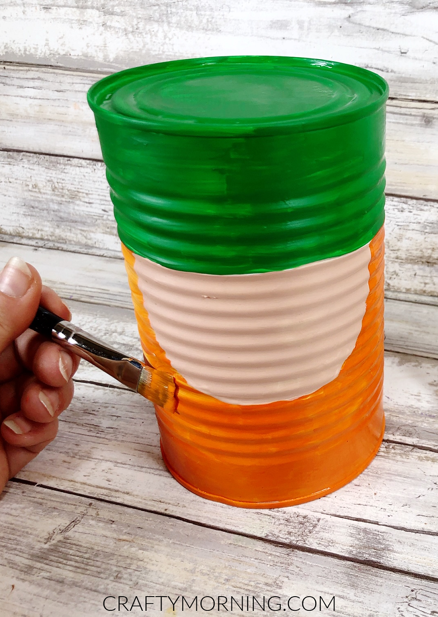 - Paint a three-inch band of green acrylic paint around the top of the large bean can. Download, print, and cut out Tin Can Leprechaun and Pot of Gold Patterns. Trace the face pattern onto the large bean can and paint with flesh tone acrylic paint of choice. Paint remainder of large bean can with orange acrylic craft paint.