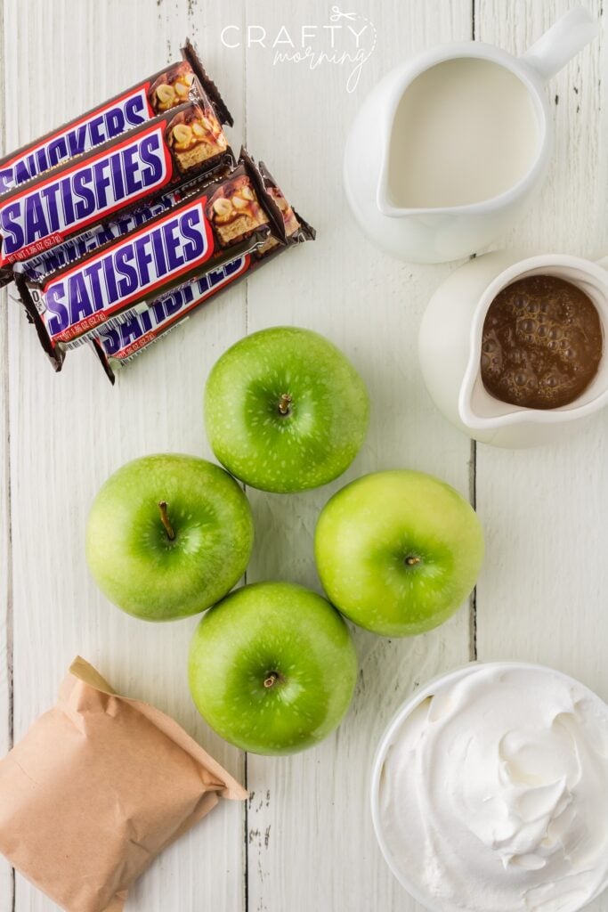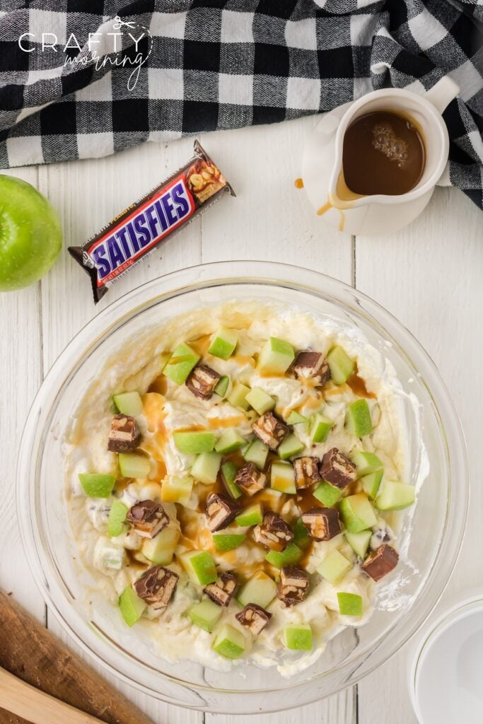 - Snickers apple salad is made of vanilla pudding, snicker bars, apples, cool whip, and then is enjoyed with caramel sauce drizzled over it.