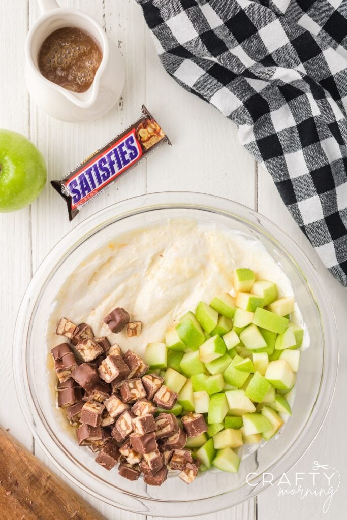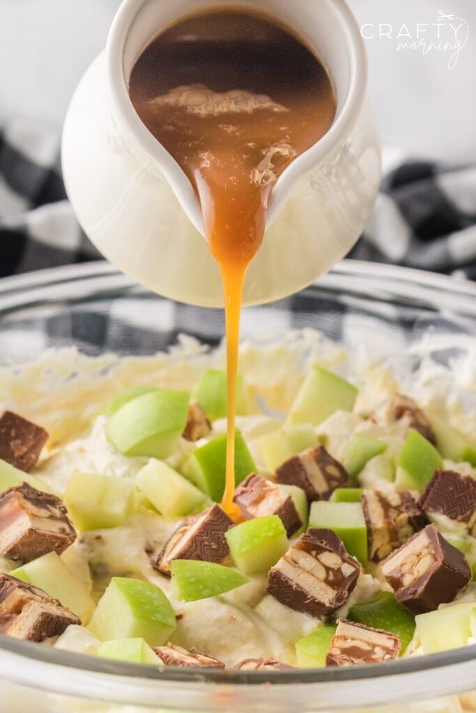 - Add the rest of the chopped snickers bars and apples on top and then drizzle caramel sauce over all of it before serving and enjoying!