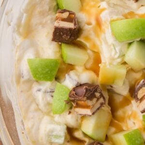 One of my favorite fall desserts to make is this snickers salad! It’s so easy and simple to make for a crowd! You can also use different candy for different flavors! Make sure to try our Twix Caramel Apple Salad, too!