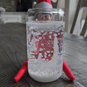 Make this fun snowstorm in a jar activity with your kids using your Elf on the shelf! It’s a great way to do a Science experiment that’s educational! It’s actually mesmerizing to watch it “snow!”