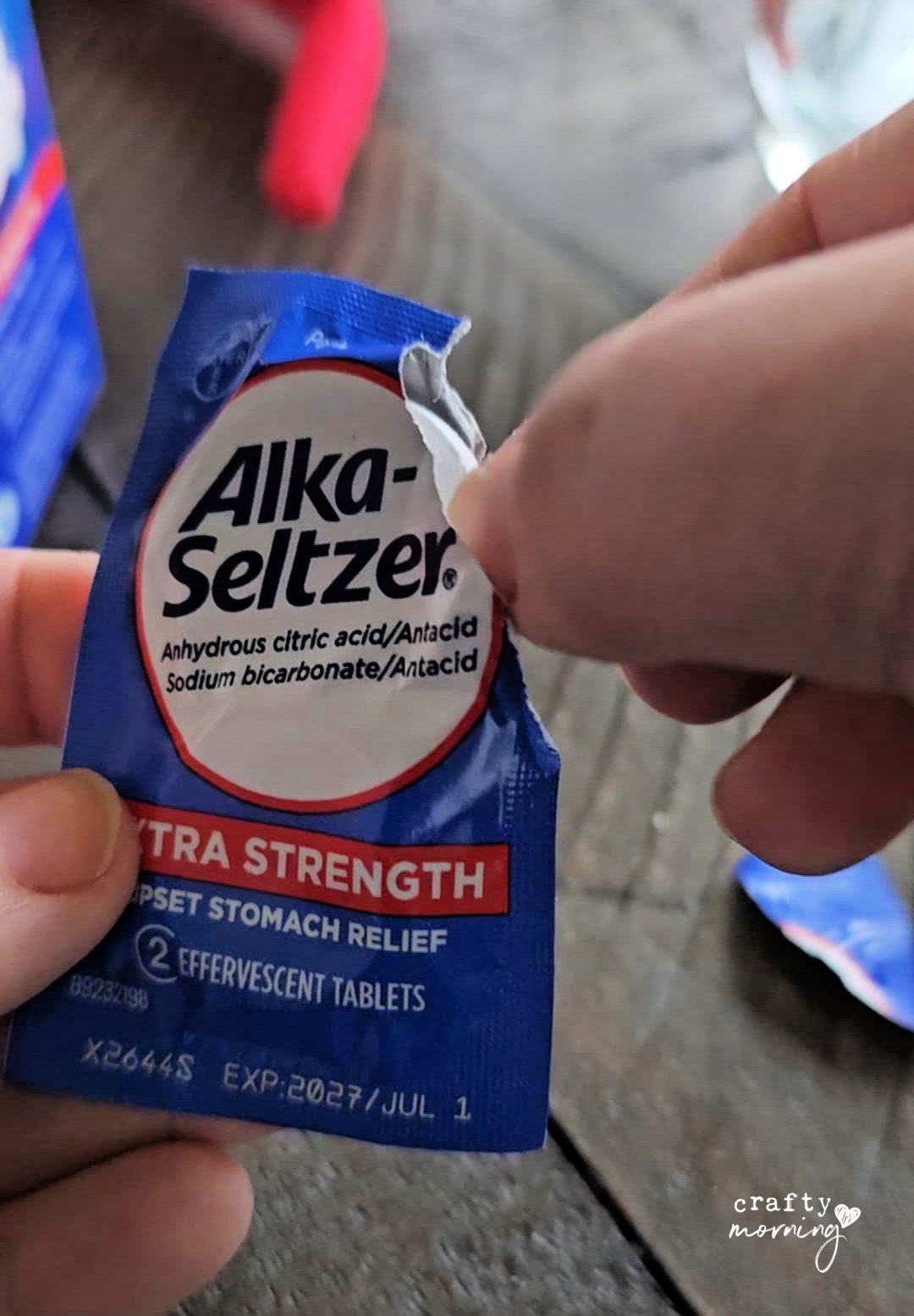 Once you drop the Alka-Seltzer into the glass, it can react for 1-3 minutes. The best part is once it’s done snowing, you can just add in another tablet! You can also break it into 3 pieces so you can keep dropping them in to make it snow! I let it sit overnight before and added the Alka-Seltzer the next day and it worked fine.