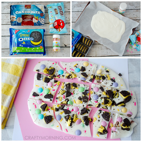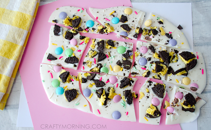 Melt the candiquik and spread it out on waxed paper. Break up the Oreos by hand and sprinkle on top of chocolate. I like the bigger chunks so you can see that bright yellow. Top with m&ms and sprinkles. Gently push into the chocolate and refrigerate for about 10 minutes. Break and enjoy! I can’t think of a prettier Easter treat. I also can’t stop eating it.