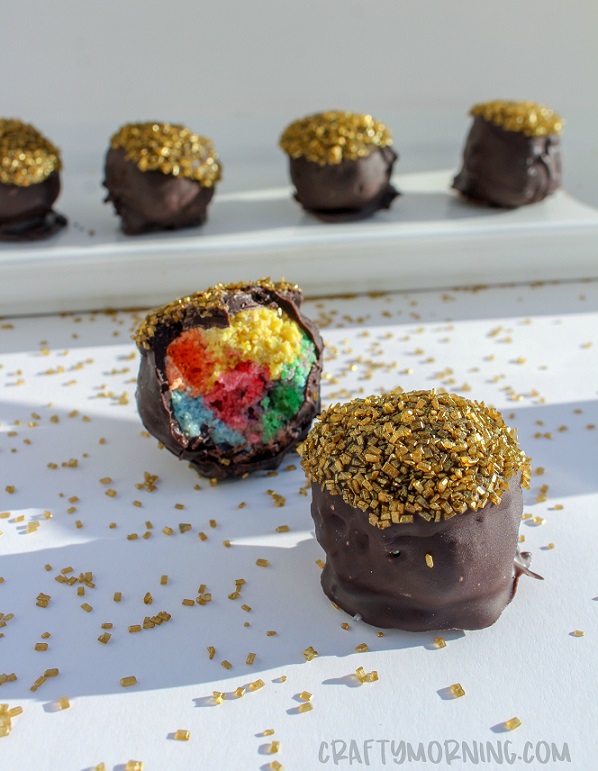- Dip the top of your cake pop into the candy melts and cover with the gold sugar sprinkles. Â It will now resemble a pot of gold! Freeze for another minute until fully set.