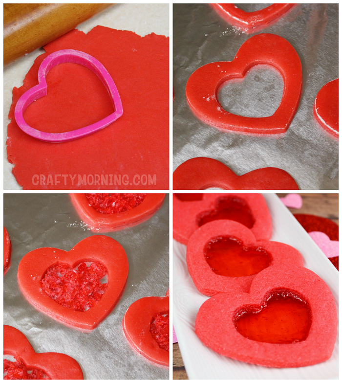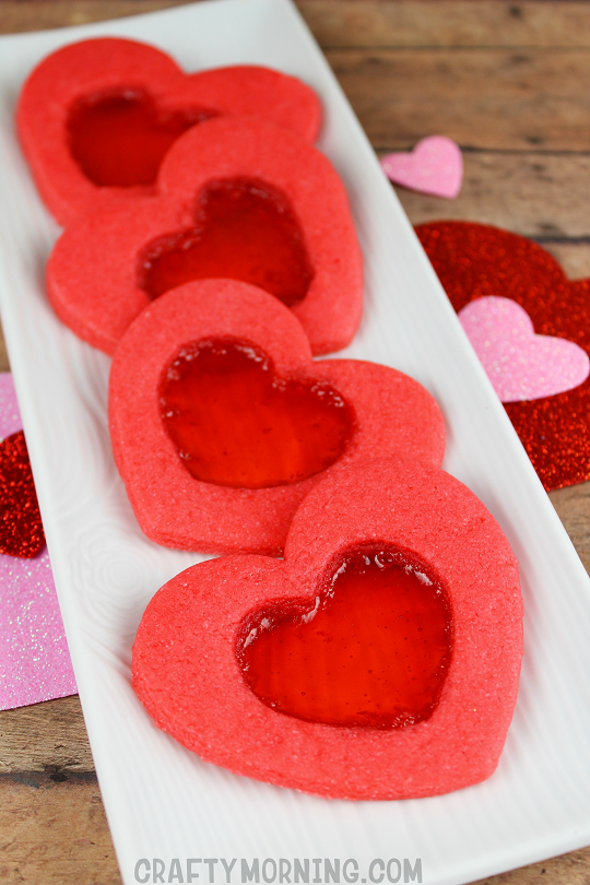 Here’s a fun Valentine’s Day cookie idea…use jolly ranchers to make a stained glass effect inside the cookie! Fun to wrap up with some ribbons for a gift.