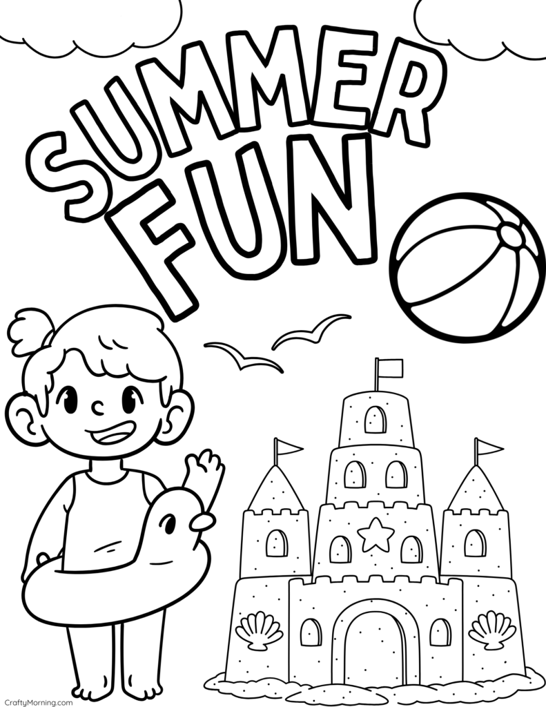 This summer fun coloring page has a big sand castle with a child in a floatie waving. There’s also a beach ball and some birds flying over.