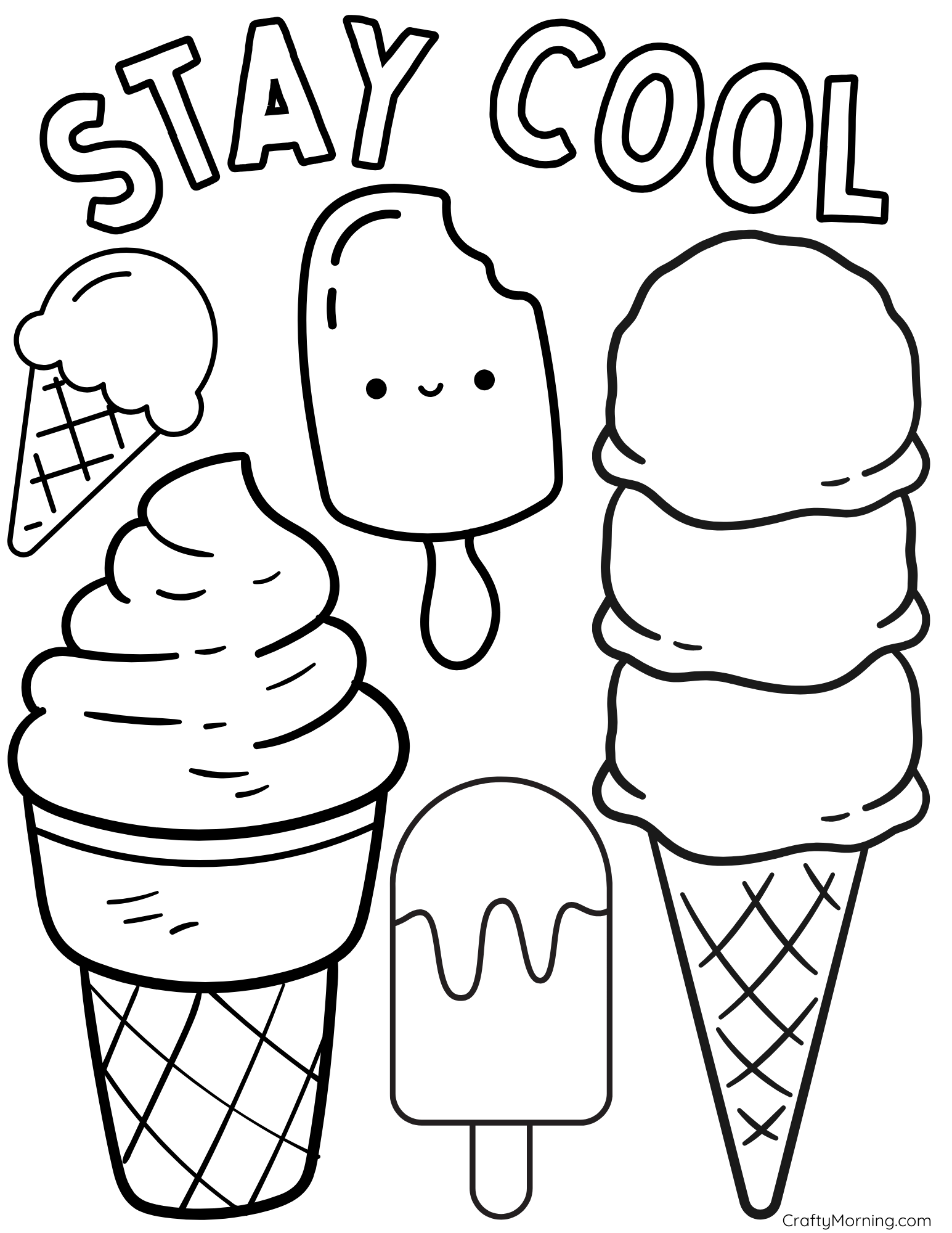 Ice cream is a MUST in the summer time so here’s a coloring sheet that has five different cones and popsicles to color. It says “Stay Cool” in bubble letters to color.