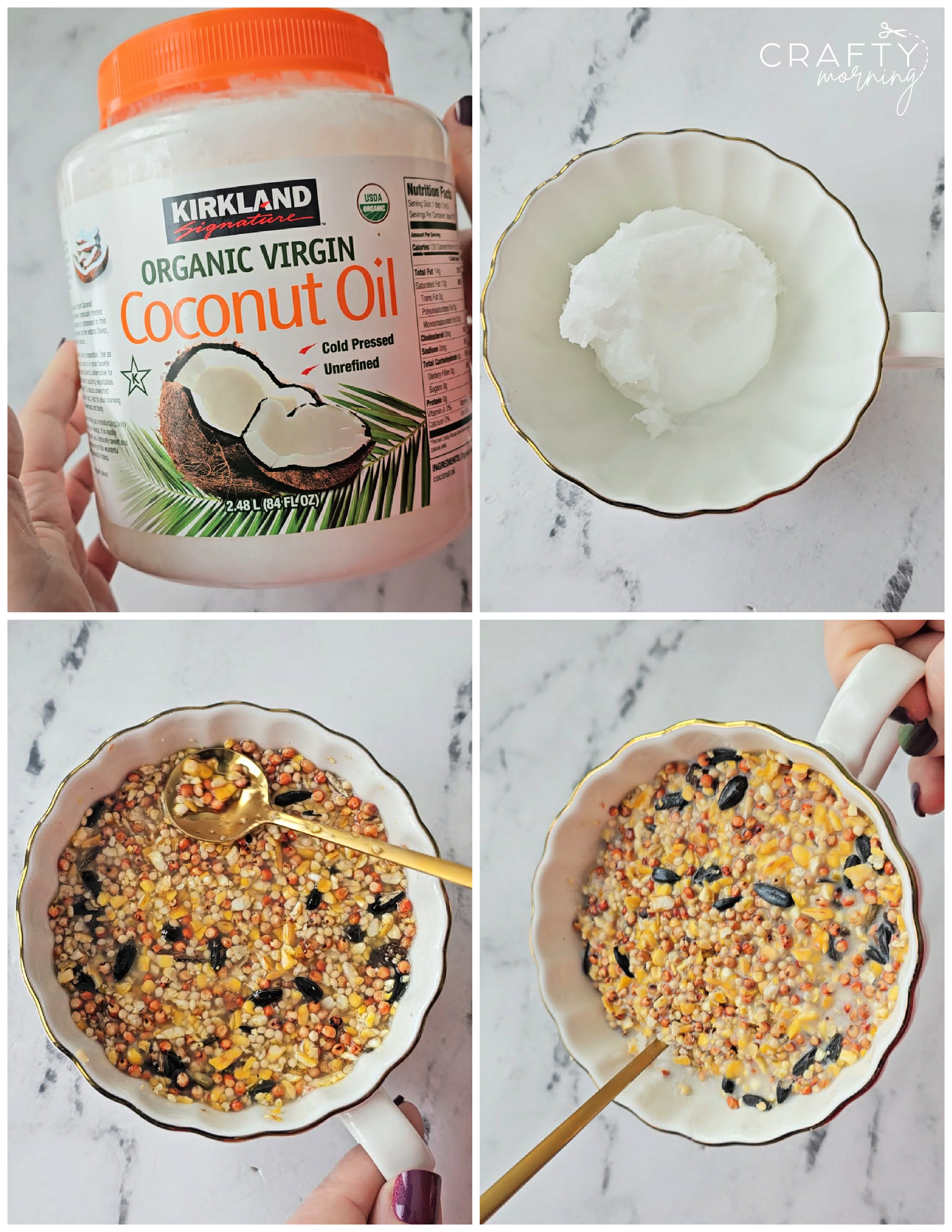 - Add in the bird seed and stir until all is coated. Use the spoon and flatten the top so it's smooth and level.