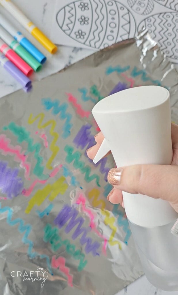 Have the kids color on tin foil with markers then spray water on it. Press the printable onto the colors and lift up! So fun!