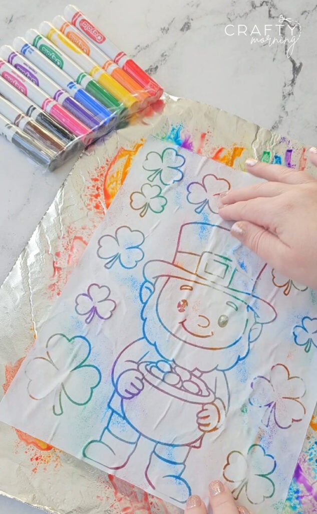 Make a fun St. Patrick’s Day craft with your kiddos! All you need to do is color rainbows with markers on a piece of tin foil, spray with water then place the printable on top.