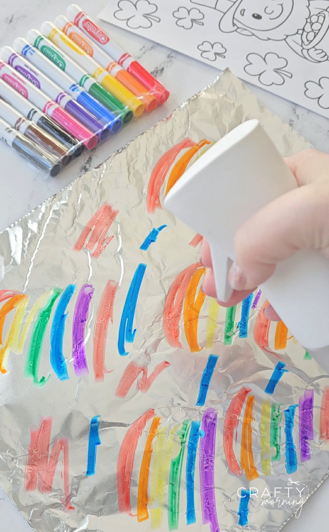 Make a fun St. Patrick’s Day craft with your kiddos! All you need to do is color rainbows with markers on a piece of tin foil, spray with water then place the printable on top.