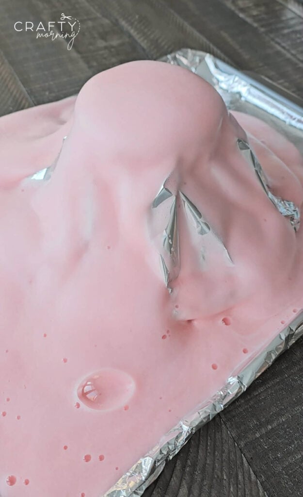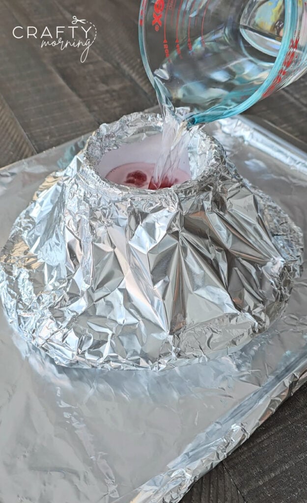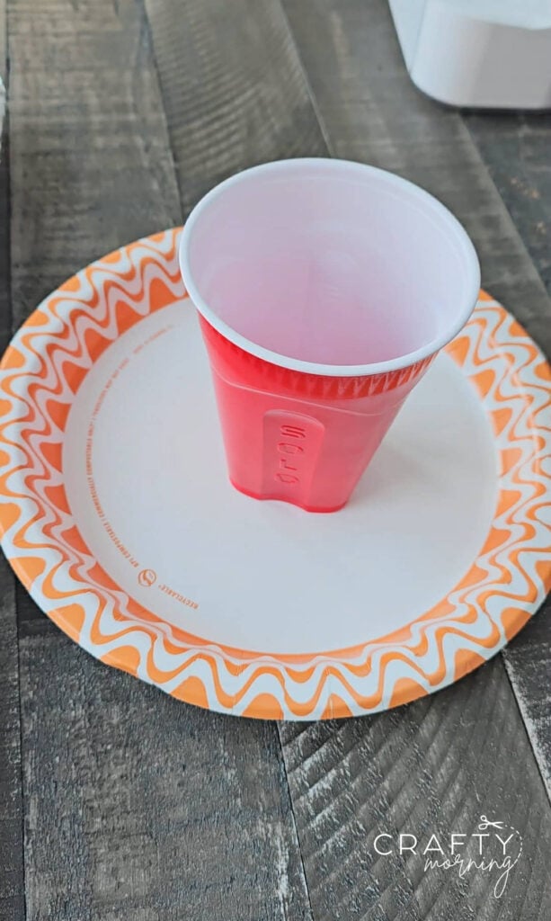- Put a solo cup in the middle of a paper plate. Take 2 sheets of aluminum foil and wrap it around so it looks like the shape of a volcano.