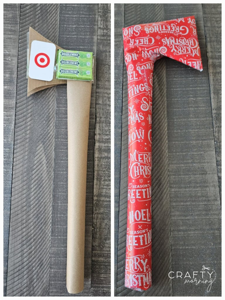 Cut out an axe using cardboard and an empty wrapping paper tube! I taped on a gift card, cash, and a 3 pack of gum (found at Dollar Tree).
