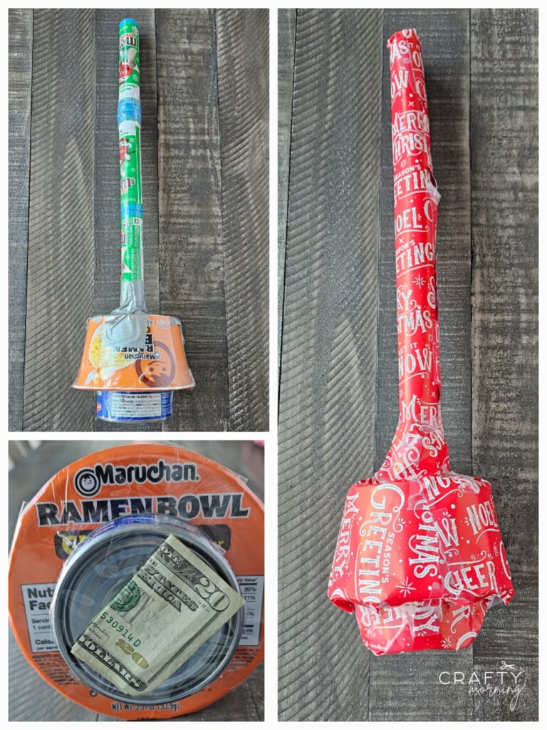 Wrap a gift like a Stanley tumbler using chicken bouillon cubes and a Prego spaghetti sauce jar! I just flipped it upside down on top of the cubes then duck taped it. I taped a lotto ticket and cash on the bottom. I then folded more wrapping paper to make a handle. I finished it by rolling up a small piece of wrapping paper to look like a straw.