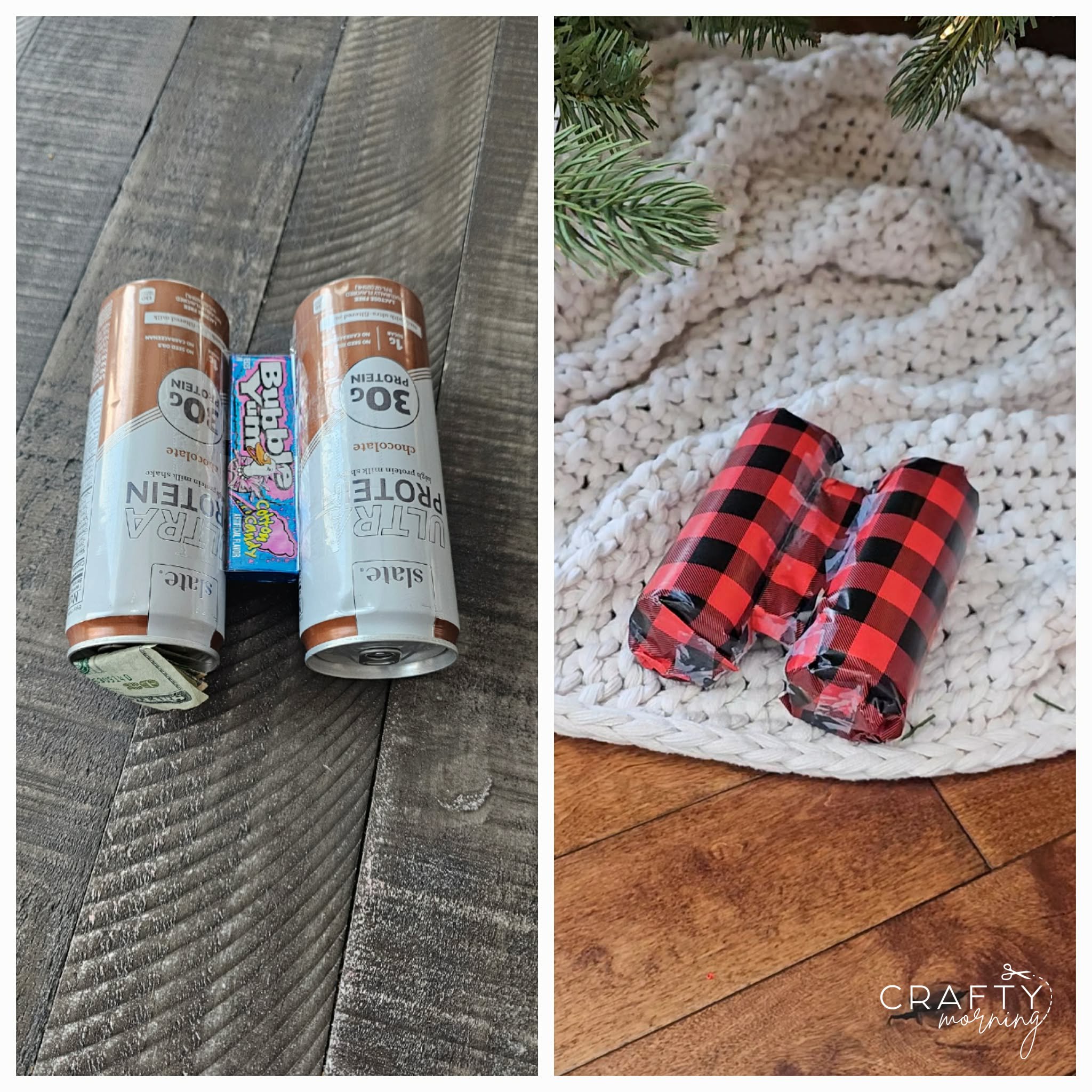 I taped 2 cans of protein drinks together with a bubblegum in the middle. Then I taped cash on the end.