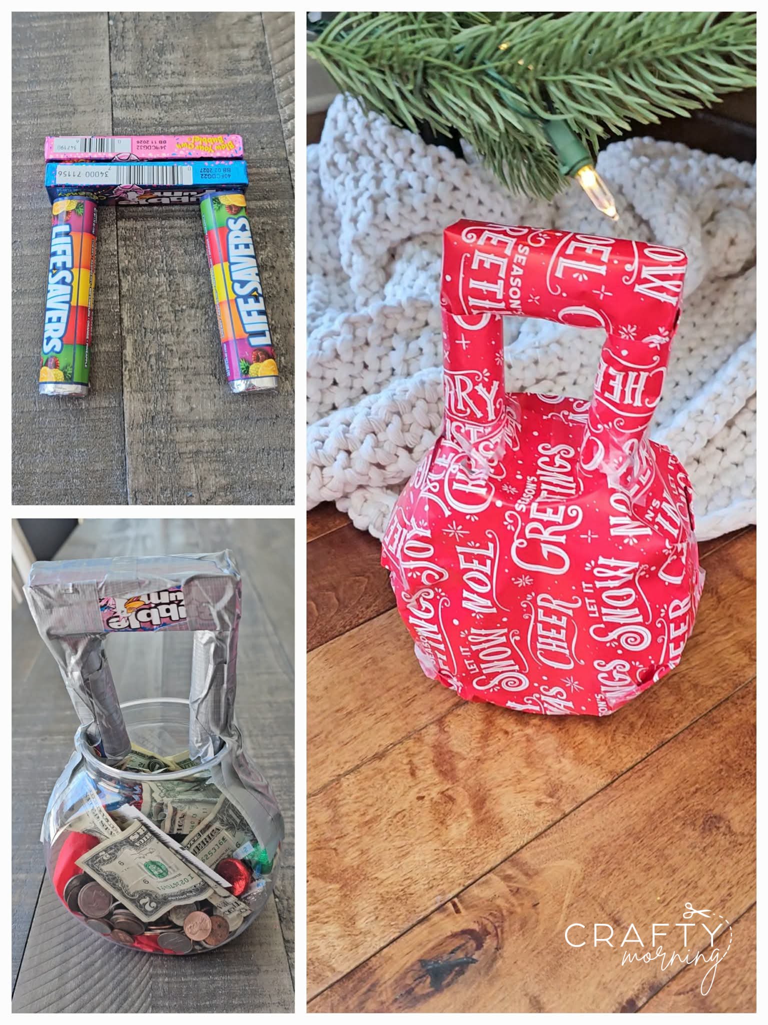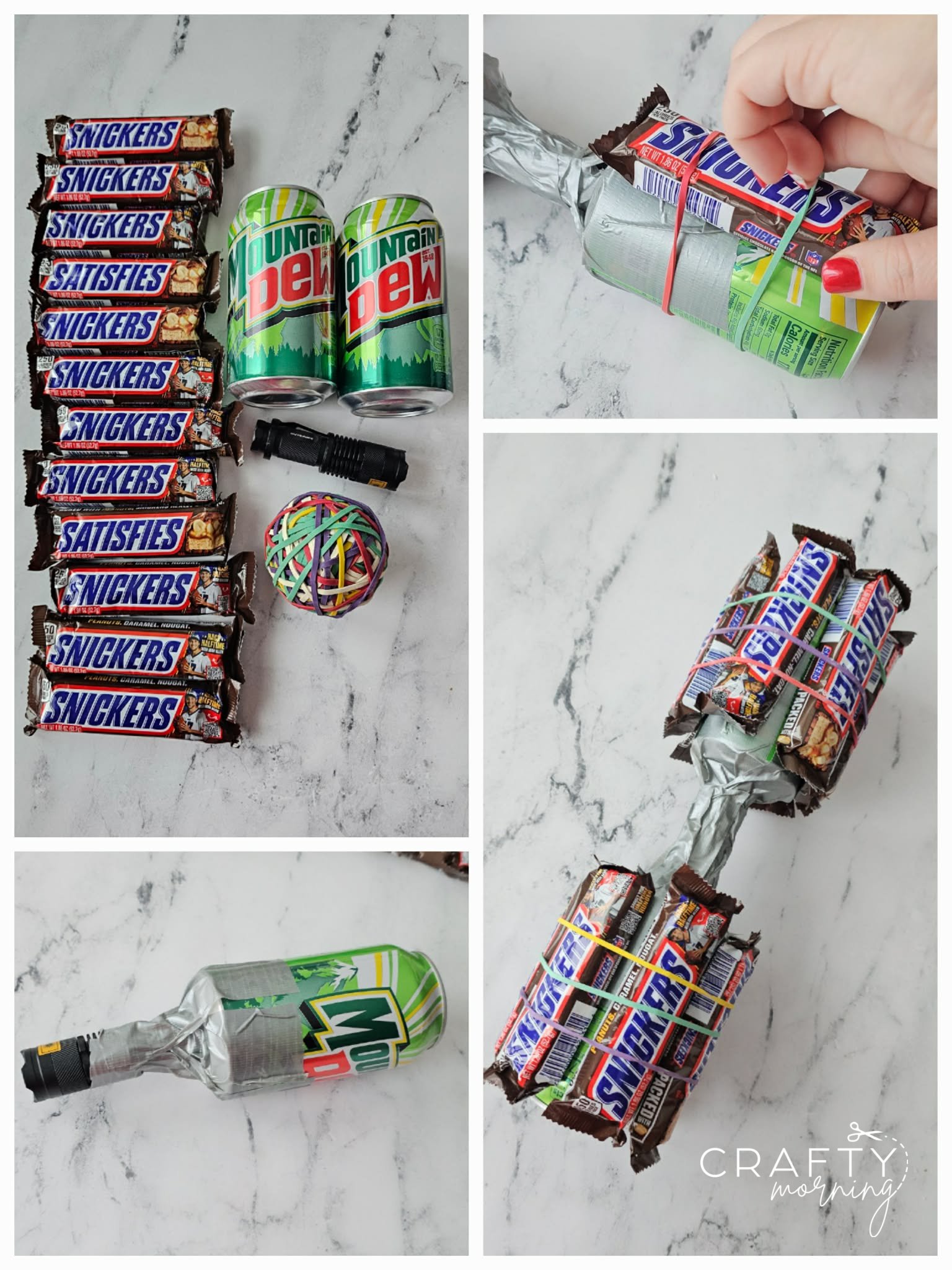 Make a “dumbbell” gift! You will need 2 cans of mountain dew, 12 snicker bars, rubberbands, a mini flashlight, and duck tape. Tape the flashlight to the ends of the pop. Stick snickers around the cans using 3 rubberbands. Then wrap!