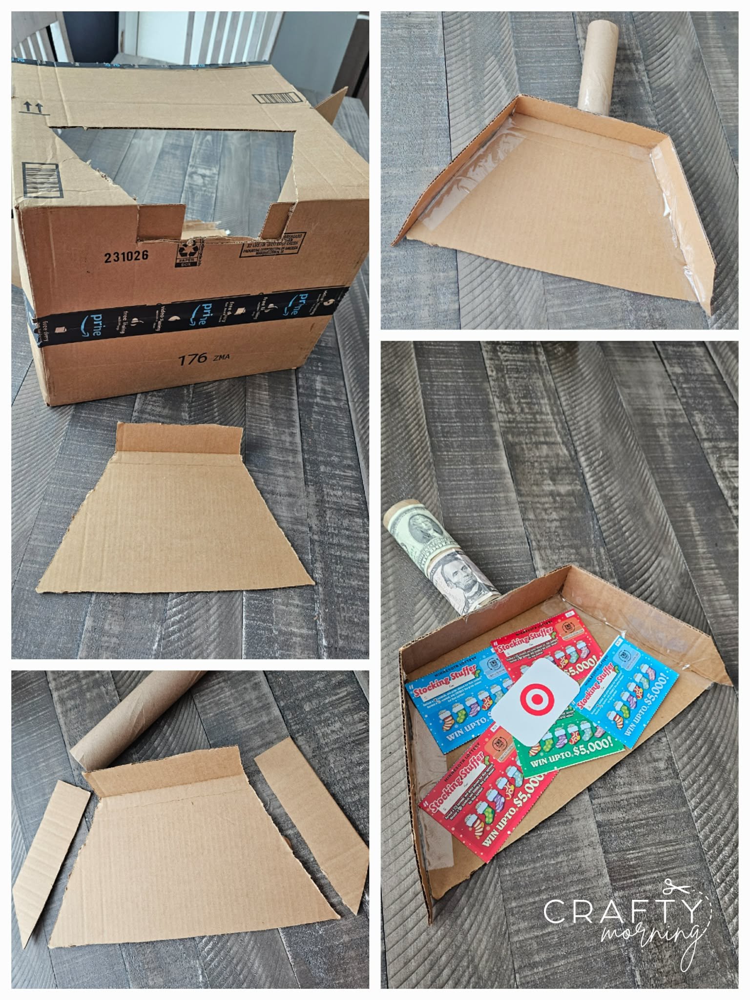 Cut up cardboard (I used an Amazon box) to make a dust pan! Then use painters tape to attach lotto tickets, cash, and giftcards!