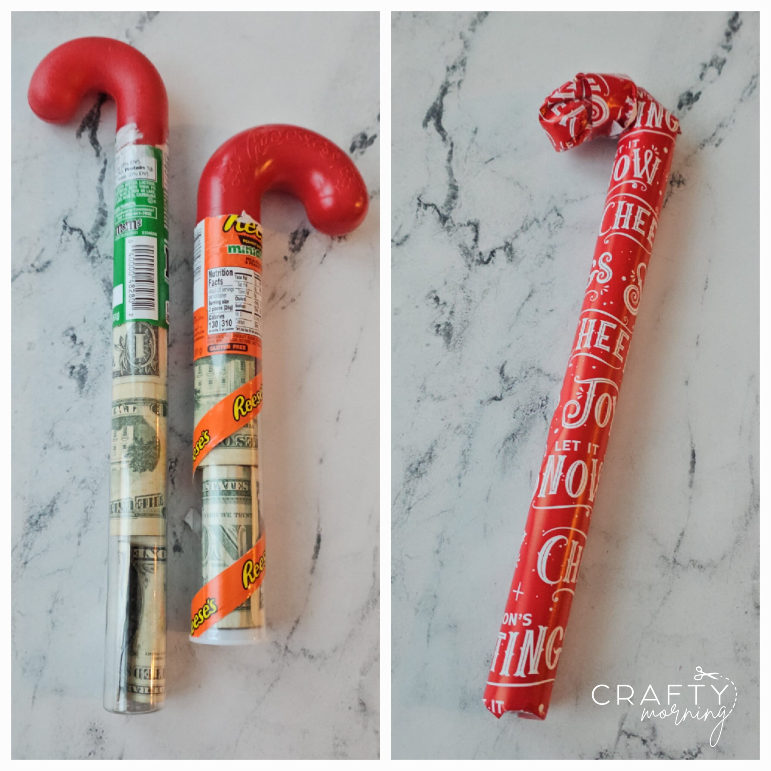 Carefully take the top off the candy cane tubes and empty the candy out. Roll your dollar bills and stick inside. Tape the top back on and wrap!