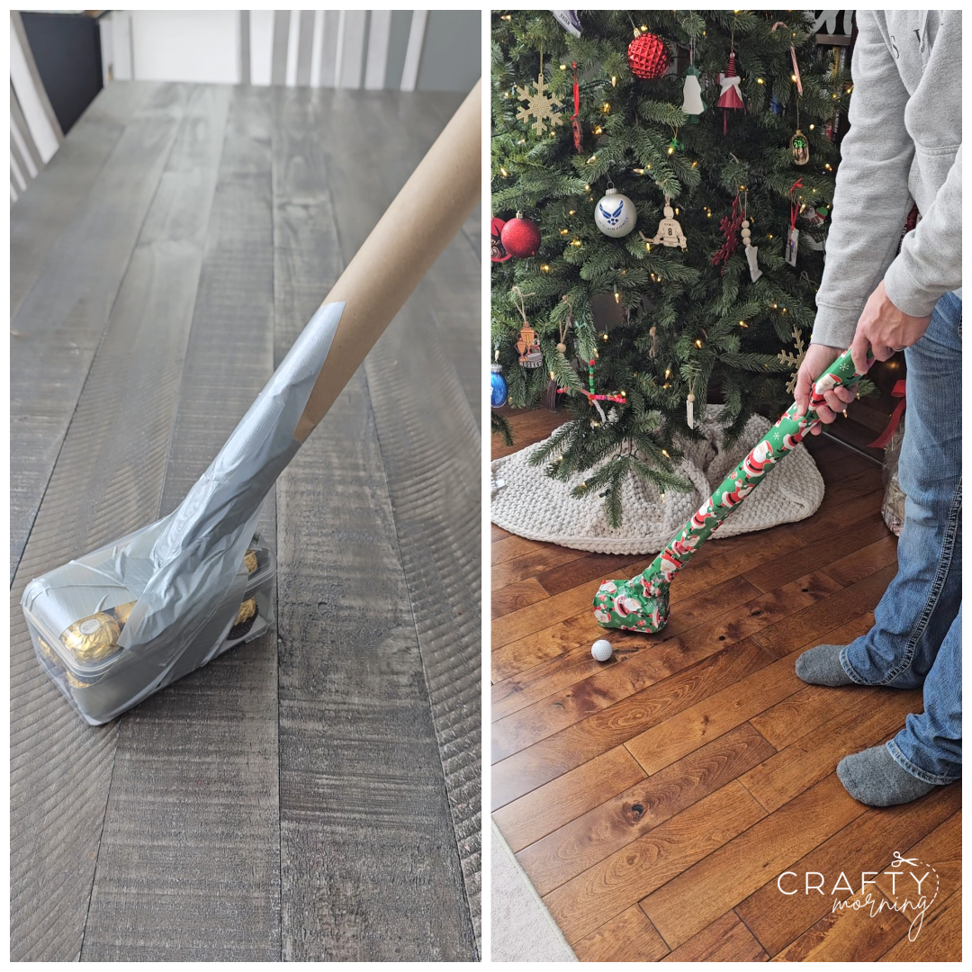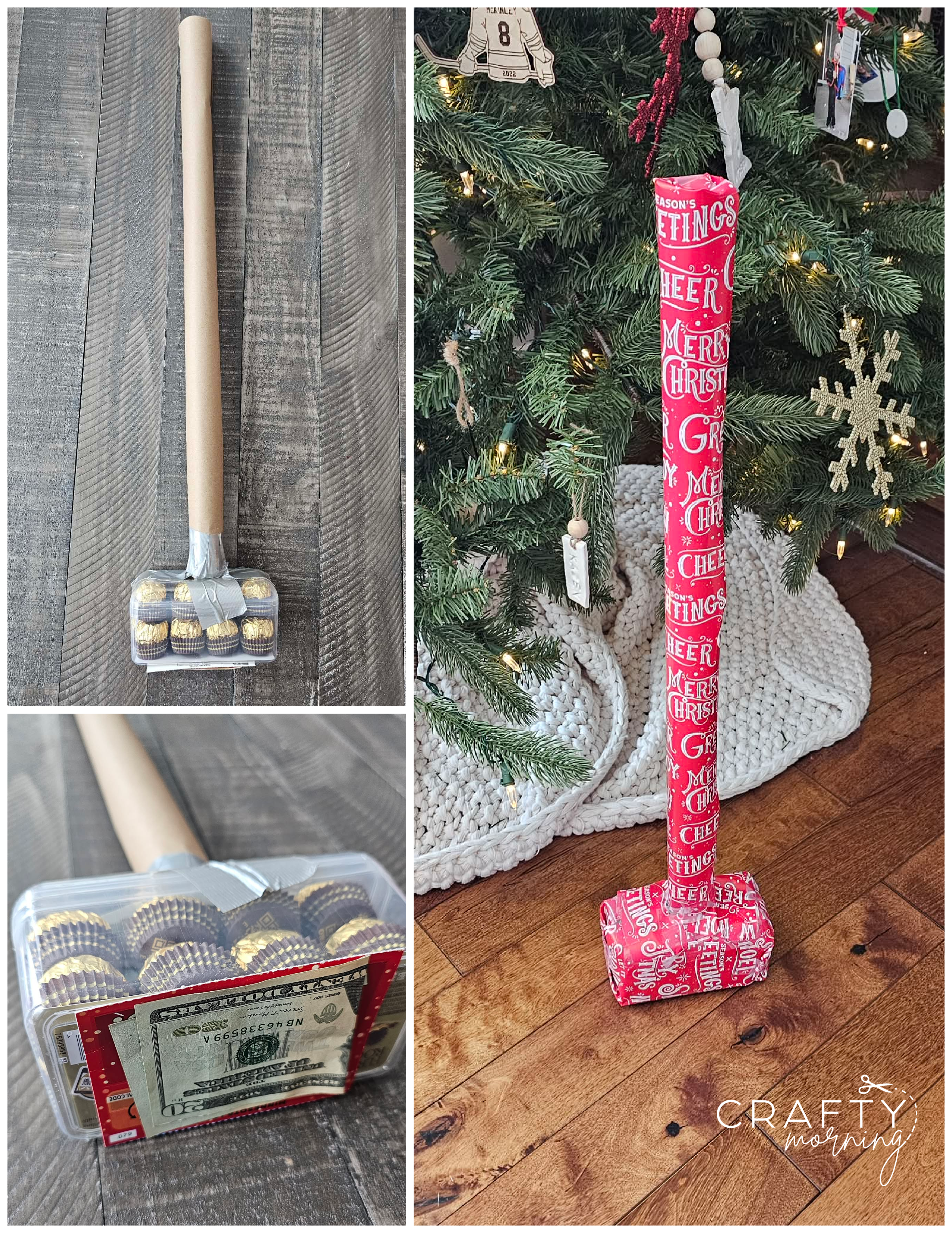 Prank your family that they are getting a new “golf club,” all you need is a 16 count Ferrero Rocher chocolate box, an empty wrapping paper tube, duck tape, and lotto tickets or cash!
