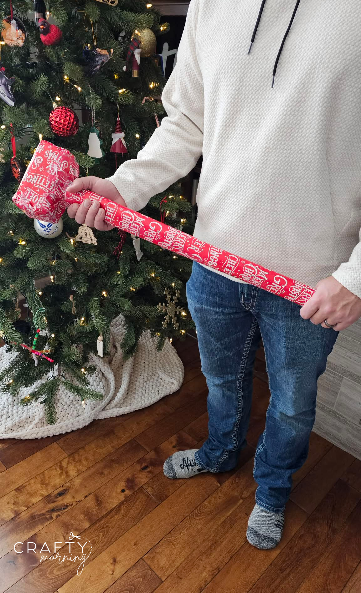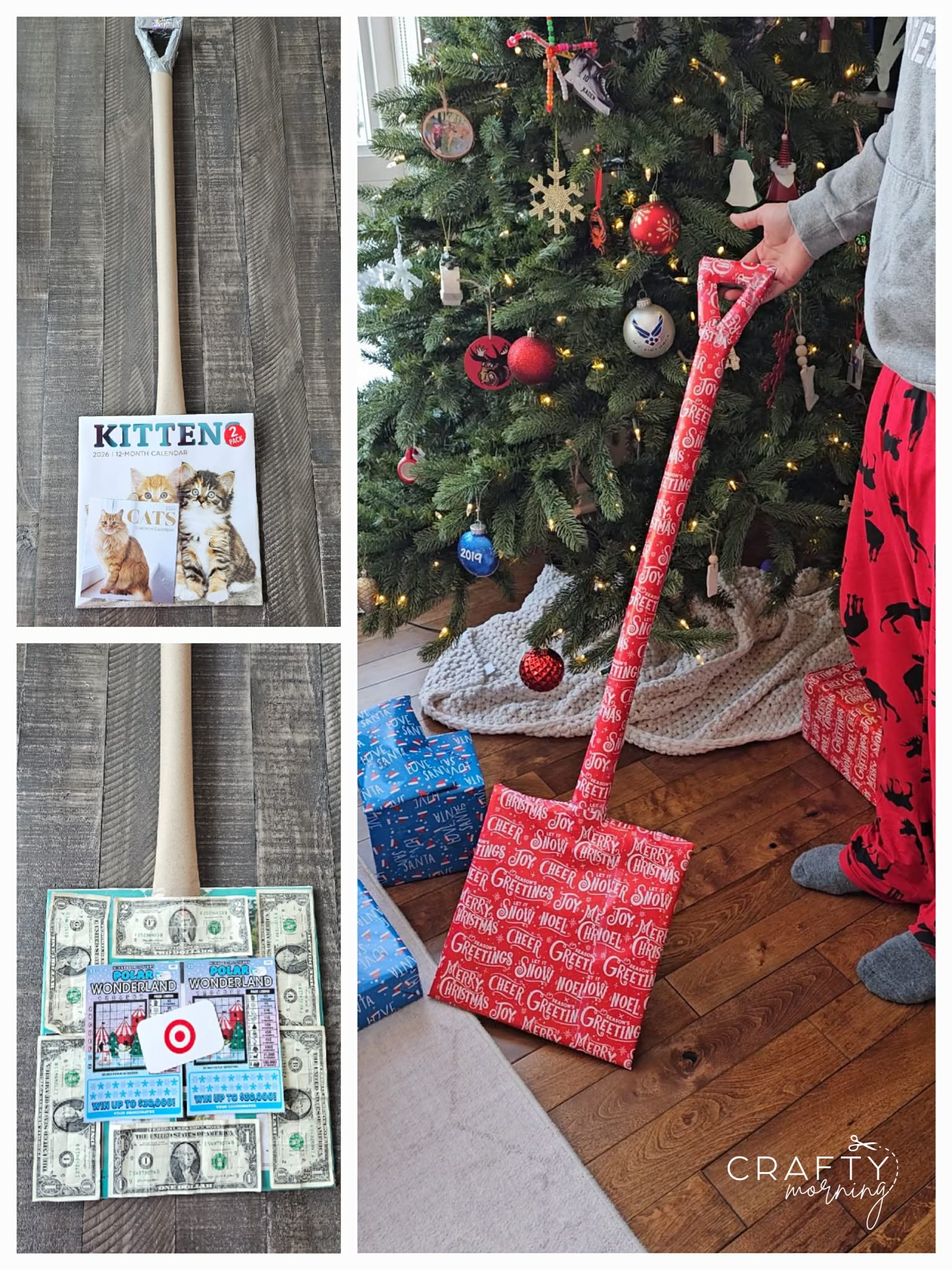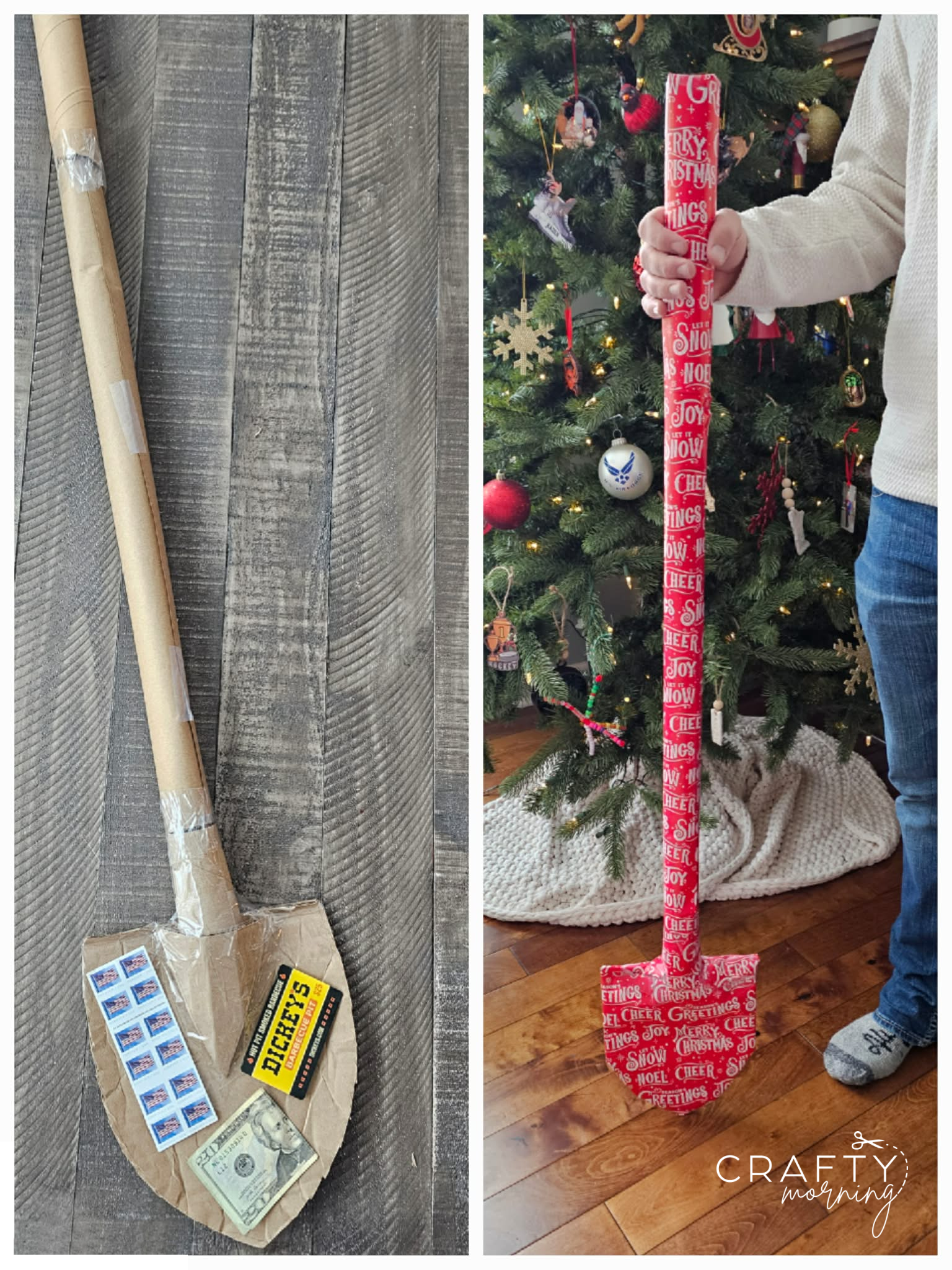 Disguise a shovel for a gift idea using cardboard, wrapping paper tubes/paper towel tubes or toilet paper rolls!