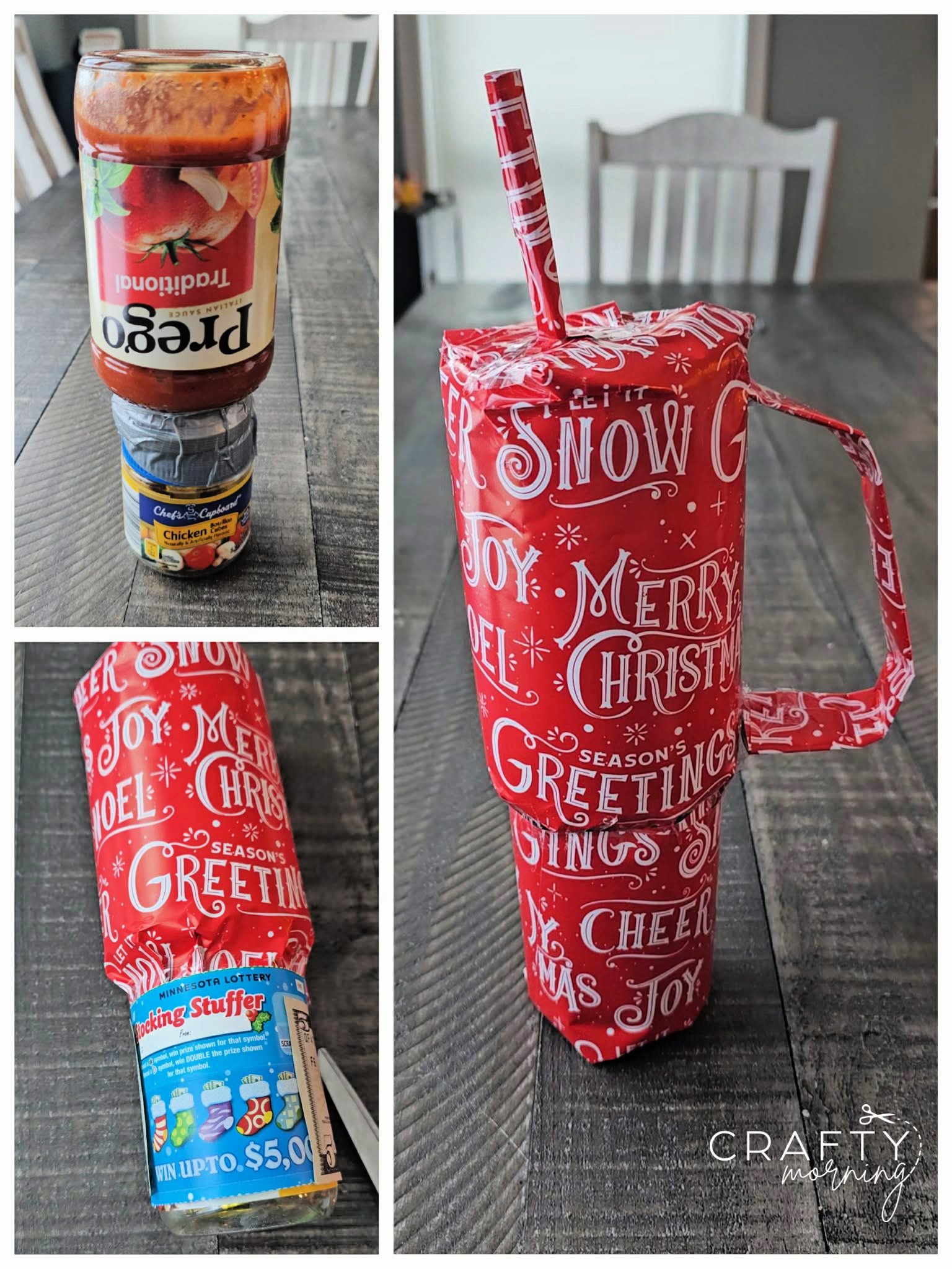 Wrap a gift like a Stanley tumbler using chicken bouillon cubes and a Prego spaghetti sauce jar! I just flipped it upside down on top of the cubes then duck taped it. I taped a lotto ticket and cash on the bottom. I then folded more wrapping paper to make a handle. I finished it by rolling up a small piece of wrapping paper to look like a straw.