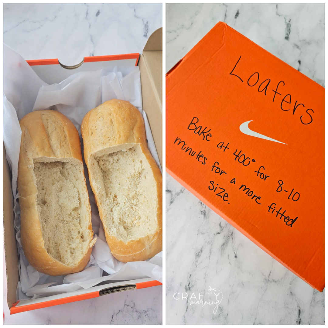 I got these sourdough bread loaves at Costco then I cut out a loafer shoe shape. I put tissue paper inside a Nike shoe box and put the bread. The box says “Loafers- Bake at 400 degrees for 8-10 minutes for a more fitted size.”