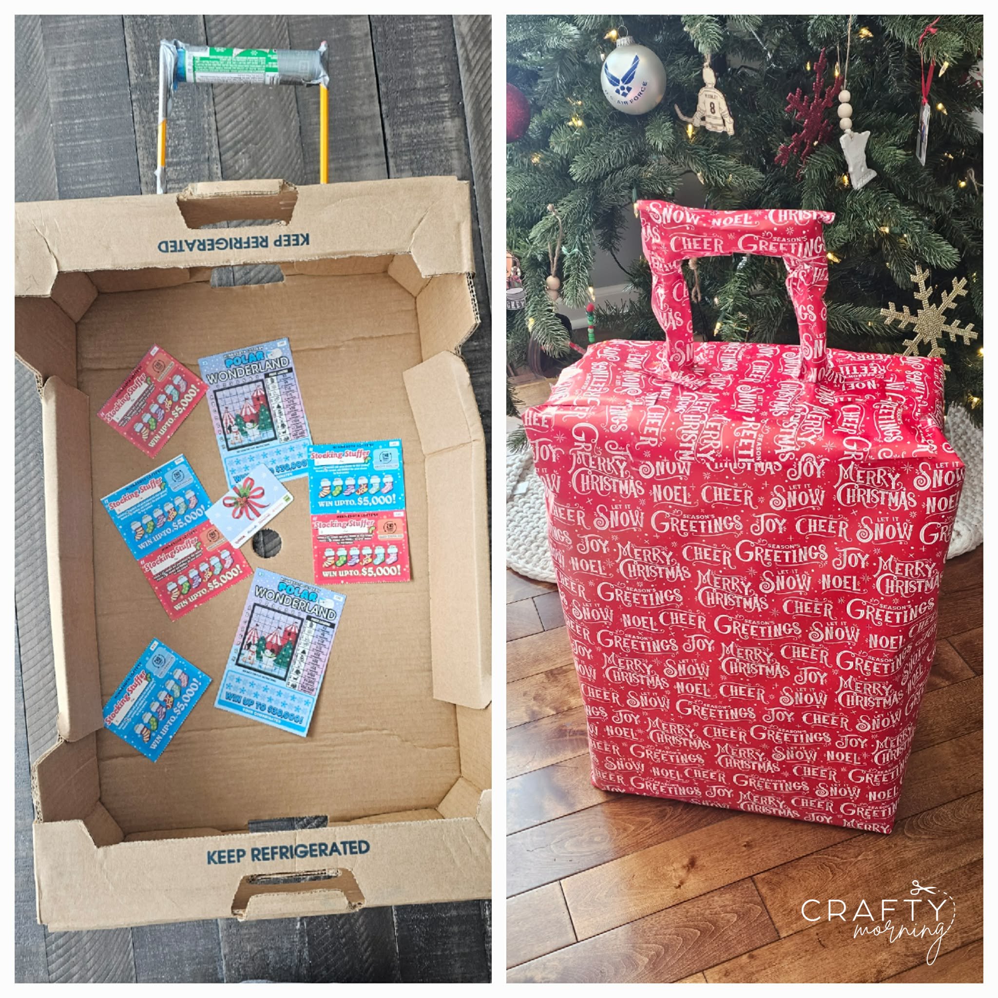 I grabbed an empty box from Costco then poked two pencils through the top. Then I duck taped a m&m candy tube across the two pencils to make the handle. I used painters tape and stuck lotto tickets/a Marshall’s giftcard inside the box!